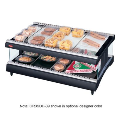 Boxed personal pizzas and wrapped sandwiches can be merchandised and held at safe serving temperatures with this Hatco GR3SDH-39 Glo-Ray Designer glass merchandiser’s heated shelf. Its thermostatically controlled base can be adjusted to accommodate specific holding needs, while heated glass technology radiates heat to the base and conducts heat to the shelf’s top, eliminating cold spots. For packaged items that don’t require heating, such as chips or fruit cups, an unheated top shelf adds display space.