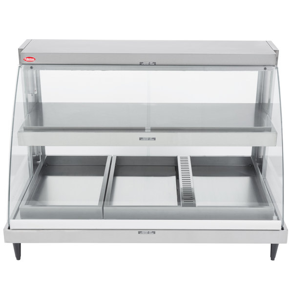 The Hatco GRCDH-3PD-120-QS Glo-Ray heated display case features a heated base and infrared top heat that holds food at safe temperatures; the top heat sends warm air to the edges where heat is usually lost to ensure food is evenly heated. Curved tempered glass retains heat and makes products more visible. The front glass tilts out so cleaning the interior is easy. Since it comes with 4-inch adjustable legs, the unit is lifted off of the countertop to prevent it from getting to hot. Shatter-resistant lights protect the food while also illuminating the cabinet interior. The Hatco GRCDH-3PD-120-QS Glo-Ray heated display case has a temperature range from 100 to 200 degrees Fahrenheit and relative humidity is adjustable from 10 to 30 percent.
