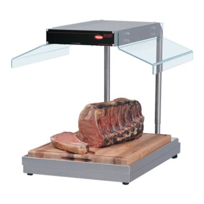 Built with overhead ceramic heating elements, the Hatco GRCSCL-24 carving station keeps food warm during slicing, while thermostatic controls let users adjust heat for precise warming. Incandescent lights illuminate the base to reduce injury risks as employees slice and cut steak, ham, and pork. To prepare meats, a cutting board must be purchased separately.