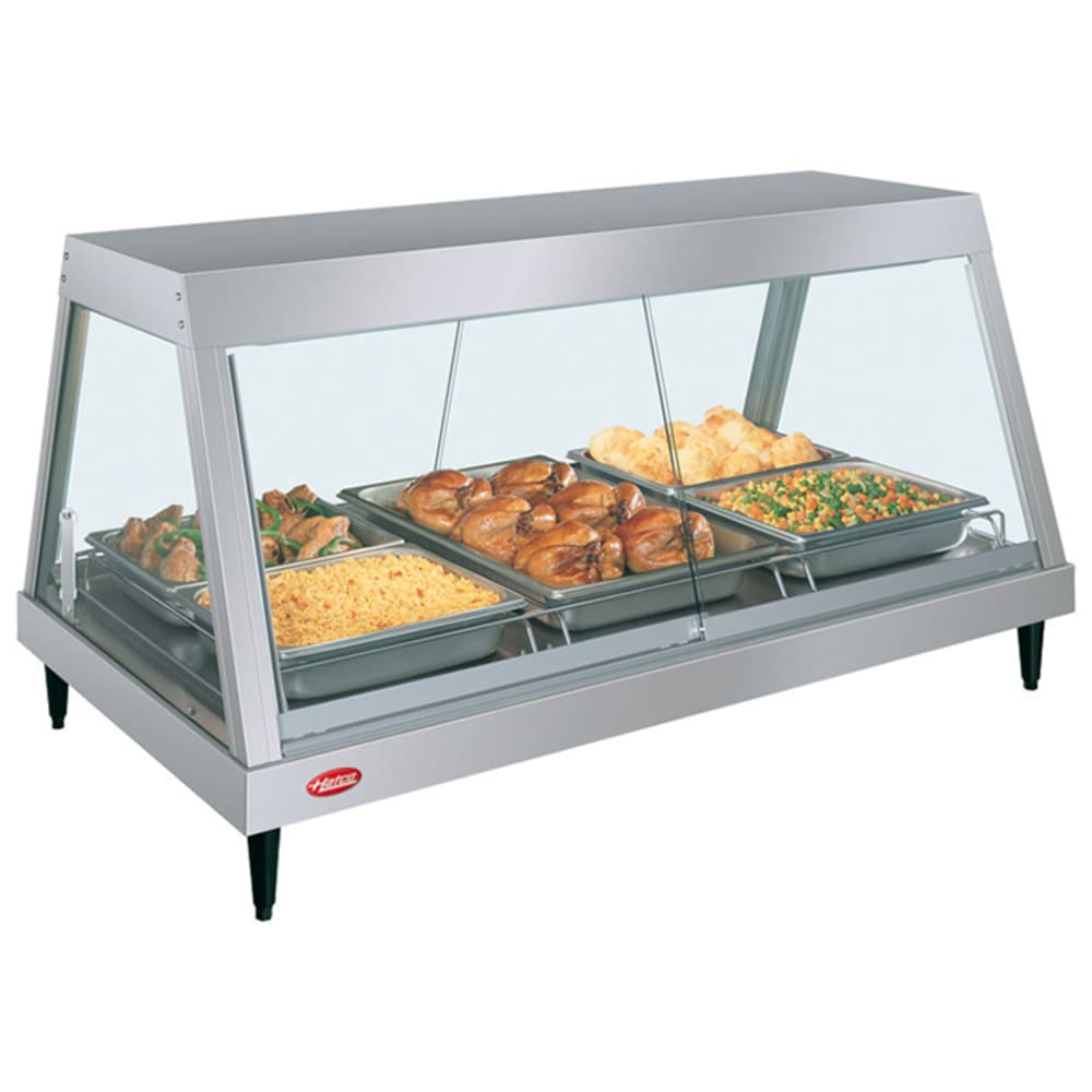 The metal-sheathed element in the Hatco GRHD-4P full-service display case heats product from above while the thermostatic controls heat the interior base, so food is kept at uniform temperatures. It uses infrared top heat, directing hot air to the outer edges of the unit to prevent heat from escaping the cabinet. The exterior base stays cool so users won’t burn themselves as temperatures are maintained within.