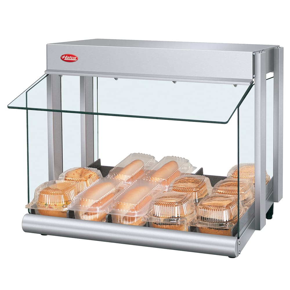 The Hatco GRHW-1SGS merchandising warmer features a slanted base and incandescent lighting to improve product presentation, and to reduce the risk of breakage, the bulbs are coated and shatter resistant. Its base is heated and thermostatically controlled to hold various food at ideal temperatures. To minimize heat loss around the unit’s outer edges, it’s equipped with prefocused infrared top heat.