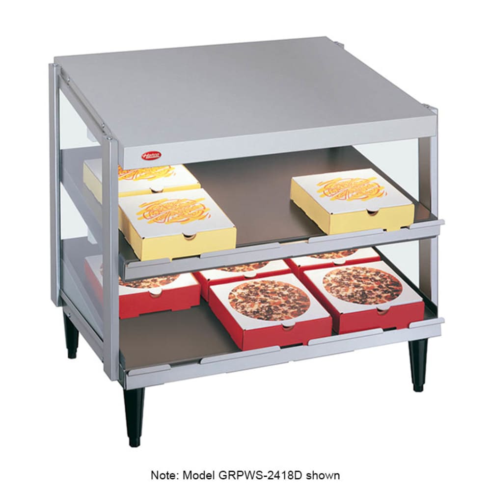 Designed to organize grab-and-go stations at convenience stores and truck stops, the Hatco GRPWS-4818D pizza warmer features a dual-shelf design for displaying pizzas with different toppings. Both heated shelves measure 46.6 inches wide by 17.8 inches deep and have a hardcoated aluminum surface with a power switch and thermostatic control to maintain optimal serving temperature.