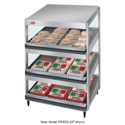 The Hatco GRSDS-36T heated display shelf is a pass-thru model designed for countertop installation. It comes with 21 adjustable divider rods with which employees can separate sandwiches, hot dogs, pizza, and other popular items. Its three forward-slanting shelves optimize visibility and increase impulse purchases. Overall, this unit measures 36 inches wide by 24.29 inches deep by 43.81 inches high.