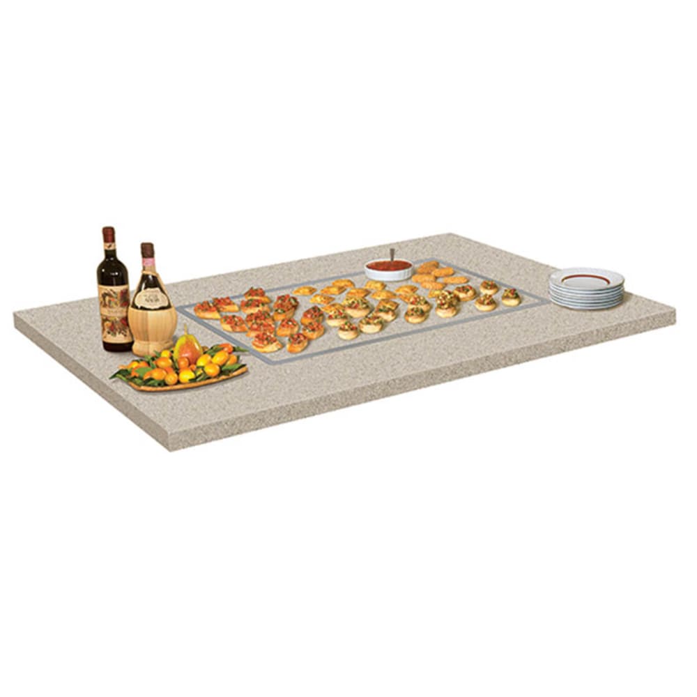 To distribute heat evenly and maintain food quality, the Hatco GRSSB-2418 heated shelf is built with a blanket-type heating element. For a contemporary, organic feel, it sports a durable simulated stone surface. Overall, this Glo-Ray-series unit measures 26.63 inches wide by 19.63 inches deep by 2.27 inches high.