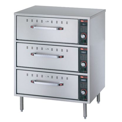Warming Drawer Unit, Free Standing, three drawers, includes (1) standard 6″ deep food pan per drawer, stainless steel construction, thermostatic controls, 4″ legs, NSF, cULus, Made in USA