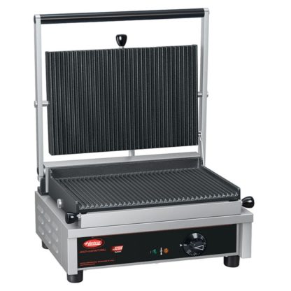 Featuring a frame made of durable stainless steel, the Hatco MCG14G multi-contact panini grill is an ideal choice for high-volume environments. This metal resists denting, scratching, and corroding, and it can be quickly wiped clean when it becomes dirty. It features an Easy Clean System to further expedite cleaning, and both of its cooking plates are dishwasher safe. The plates are grooved to create grill marks on both sides of a panini or chicken breast.