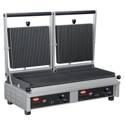 The Hatco MCG20GS-240-QS double panini press has removable plates made of enamel-coated cast iron to reduce sticking. Its top plates are grooved, but the bottom plate is smooth. They can be interchanged with other styles of plate to adjust the cooking effect. For streamlined cleaning, the plates can be washed in a dishmachine, and the drip tray is removable with grip handles for stability. The top plates can be operated independently, so users can prepare different foods with a single piece of equipment.
