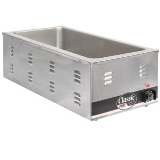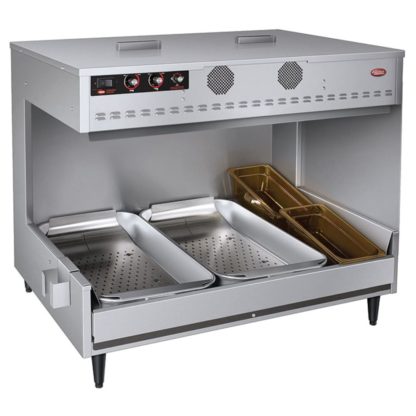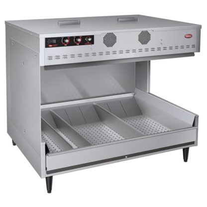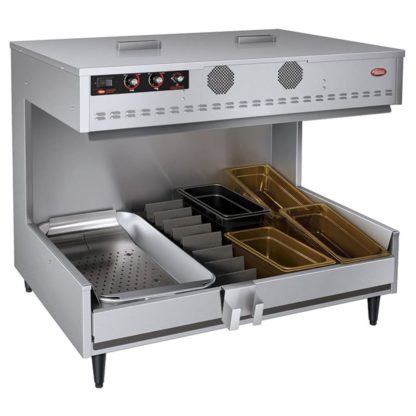 Multi-Product Warming Station, 37-3/8″ wide, (6) overhead ceramic heating elements with 2 separate electronic infinite controls (front & rear), thermostatically controlled heated base, master on/off toggle switch, coated shatter-resistant incandescent display lights, removable side panel (fits left or right), stainless steel construction, cULus, UL EPH Classified, ANSI/NSF 4, Made in USA, 120/208v/60/1ph