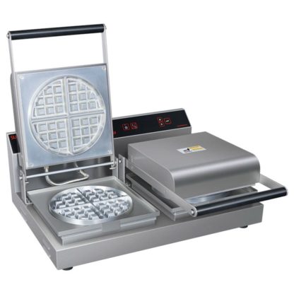 Great for cafes and coffee shops, the Hatco RWM-2 double waffle maker can cook two 7-inch-diameter waffles simultaneously. These waffles are traditional-thin and round with a crispy exterior and shallow pockets that hold syrup and butter. Because of their exclusive design, the heating elements in this unit evenly distribute heat for high-quality, consistent baking. The waffle iron heats up quickly, both after it is initially turned on and after batter is added to the plates. To reach the ideal crispness for each waffle, operators can adjust the bake time and temperature on the waffle maker.