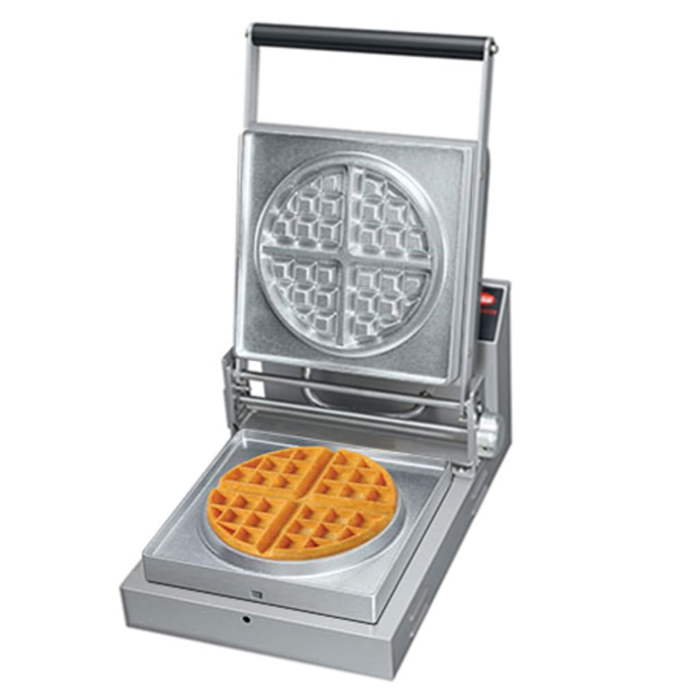 The Hatco SNACK-1-QS Belgian waffle maker has a sturdy frame made of stainless steel to add strength to the unit and aluminum waffle plates that distribute heat evenly during cooking. Designed with a simple one-touch release feature, the plates can be quickly removed for cleaning in warm, soapy water. This unit includes circular Belgian waffle plates, a cleaning brush, and one additional set of plates in another design. To ensure consistent product, this unit features four programmable presets that can be used to quickly recall and implement frequently used recipes.