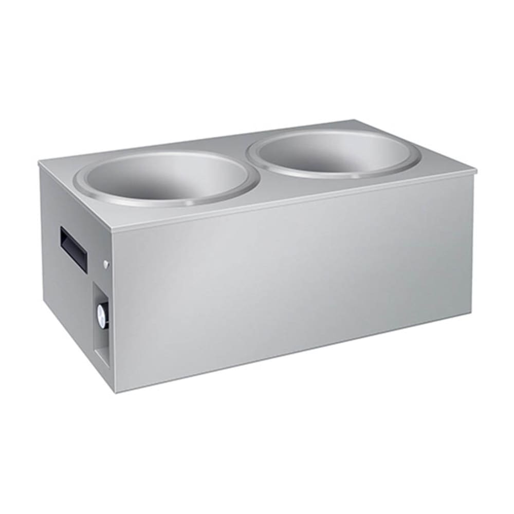 For dual merchandising, the Hatco SW2-11QT soup warmer features two circular wells that accommodate 11-quart pans. This 25.50-inch-wide by 15.38-inch-deep by 10.70-inch-high countertop unit is made of rust- and corrosion-resistant stainless steel for durability, and because a cord is built into the back, it boasts a sleek, streamlined presentation on self-service counters. Its two recessed side handles lend a comfortable, secure grip so users can move this well for cleaning and maintenance.