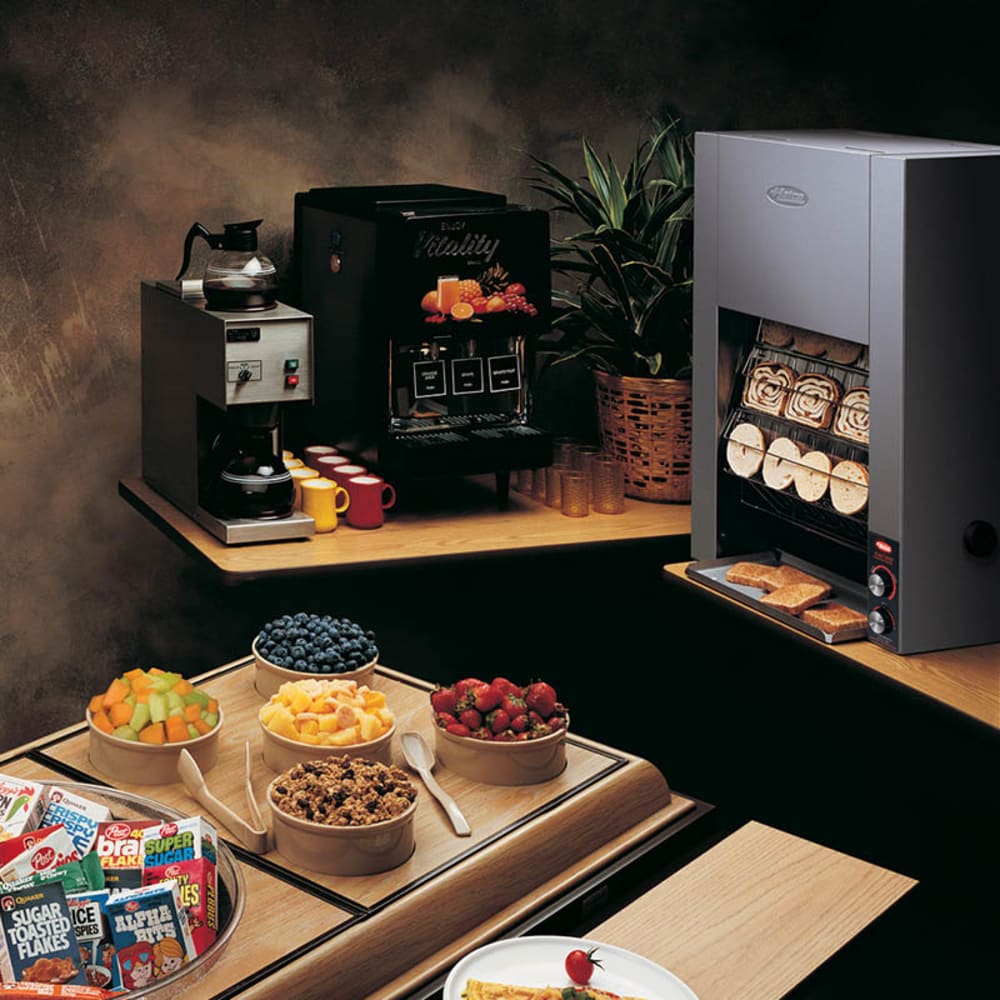 In an hour, the Hatco TK-100 Toast King conveyor toaster can produce 1,000 slices of toast, accommodating three slices of bread, buns, or Texas toast side by side. Buns as wide as 5.5 inches and toast as thick as 1.25 inches fit in the unit, and operators can change the conveyor speed to adjust the browning level, rather than changing the temperature. For deeper browning, a slow speed will keep the bread on the conveyor longer. On the front, the operator can use the toast color selector and variable speed knobs to adjust how long the product is inside the toaster. After bread is toasted, it sits on a heated, aluminum plate that keeps it warm and dry. To protect against burnout, the heating elements are sheathed in metal, while the Hatco TK-100 vertical conveyor toaster is made of heavy-duty stainless steel.