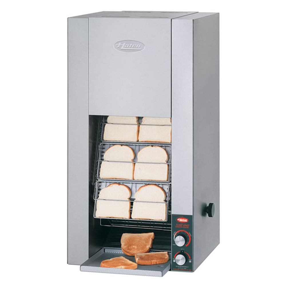 The Hatco TK-72 Toast King vertical toaster accepts buns as wide as 5.5 inches and toast as thick as 1.25 inches. It’s useful for crisping both bread slices and buns, and it toasts as much as 720 units per hour. Designed to take up a small footprint, it measures 18.25 inches wide by 17.63 inches deep by 33.25 inches high. This unit’s heating elements are metal sheathed to withstand commercial use, and the exterior is made of stainless steel that’s durable and rust resistant. For loading and unloading product, the tray can be extended 3.5 inches.