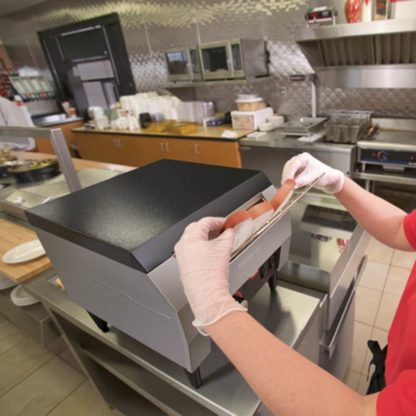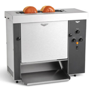 Bread in the Hatco TQ-1800 Toast-Qwik conveyor toaster is loaded through a 2-inch opening, and it discharges from the front or rear. The ball-bearing motor and heating elements are permanently lubricated for an extended life, and to keep the exterior cool to the touch, the unit is insulated and includes an interior fan. This toaster can be used with all types of bread, and it crisps as many as 30 slices per minute. When bread is done toasting, it can be held in the storage area to keep it warm until it’s ready to be served.