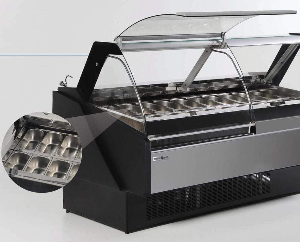 Hydra Kool KFM-GL Series Curved Glass Gelato Cases combines efficient, high volume merchandising and exceptional refrigeration with an elegant curved glass front for the sophisticated presentation of gelato products.