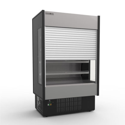 Hydra-Kool Grab-N-Go Open Merchandiser with Electric Shutter, multiplexible, 29-1/5″W x 31-1/2″D x 82-9/16″H, (4) adjustable shelves with product stops, LED lighting in canopy & under all shelves, key-lockable electric night curtain, digital controller, PVC coated grey steel interior, silver front panel & grey bottom front panel on exterior, adjustable feet, self-contained refrigeration, ETL-Sanitation, cETLus
