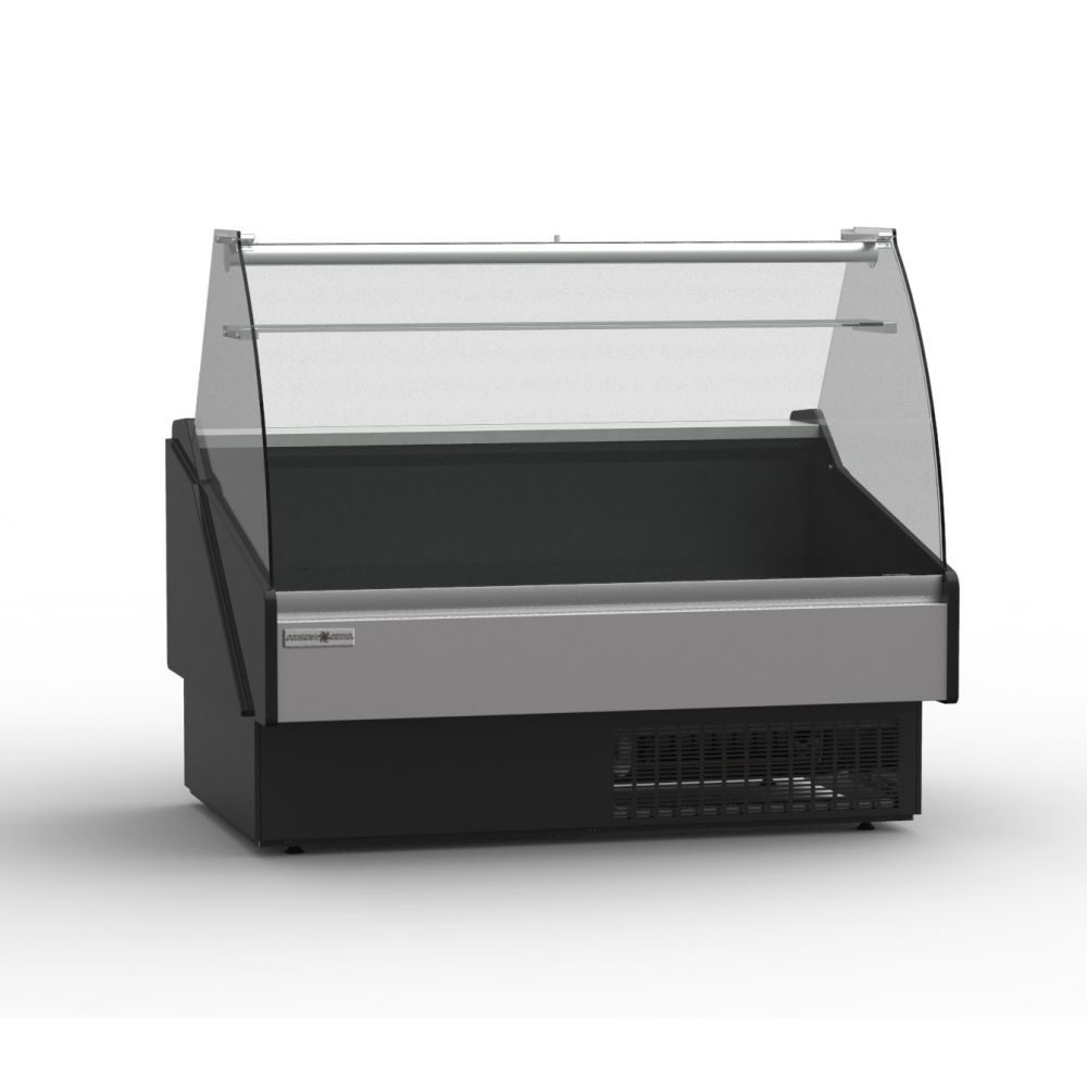 The KPM-CG-100-S is a deli display case made by Hydra-Kool with 32.54 cubic feet of storage in its front compartment, and 13.41 cubic feet of storage in its rear refrigerated compartment. This deli case is built with tempered side glass and rear sliding doors, and houses one tempered glass shelf in its front compartment. Additionally, the KPM-CG-100-S has a tilt-out curved glass front.