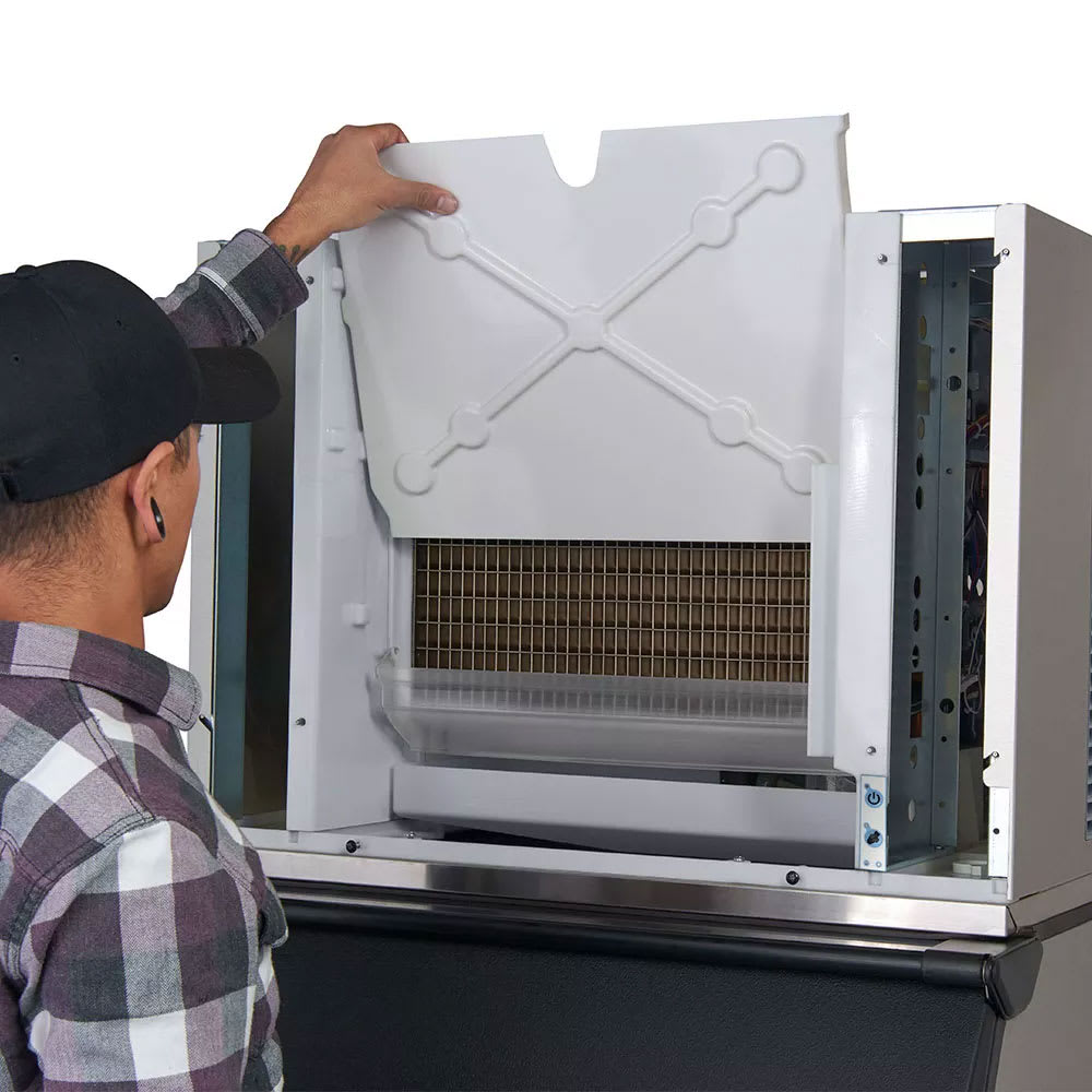 This Ice-O-Matic CIM0320HA ice maker head protects against bacteria and can clean itself with the touch of a button. To prevent obstructions in the exhaust, the machine is air-cooled and discharges from both the sides and the top. With no hard-to-clean crevices, this unit is energy efficient, using BPA-free plastic and recyclable parts. It includes snap-in, snap-out, dishwasher-safe components and an LED light to indicate when cleaning is required.