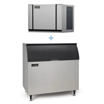 Elevation Series Modular Cube Ice Maker w/ Bin, air-cooled, self-contained condenser, dual exhaust top/side air discharge, 30″ W, approximately 520 lb production/24 hours at 70°/50° (390 lb at 90°/70°), half-size cubes, PURE ICE built-in antimicrobial protection, LED status display, one touch sanitize/descaling controls, dishwasher safe food zone components, 115v/60/1-ph, 17.8 amps, cULus, NSF, CE; Ice Bin w/ Filler Panels: 854 lb storage capacity, 48″W x 31″D x 50″H, top-hinged, slope front door, for top-mounted ice maker, polyethylene interior, durable stainless finish exterior, 6″ legs, NSF