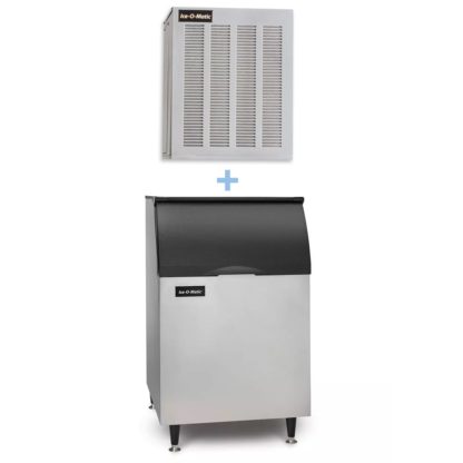 Pearl Ice Maker, soft, chewable ice crystals, air-cooled, self-contained condenser, approximately 464 lb/210 kg production/24 hours, durable stainless finish, cULus, NSF, CE; Ice Bin w/ Bin Top: 510 lb storage capacity, 30″W x 31″D x 50″H, top-hinged, slope front door, for top-mounted ice maker, polyethylene interior, durable aluminum exterior, 6″ legs, NSF