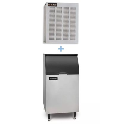 Pearl Ice Maker w/ Bin, soft, chewable ice crystals, air-cooled, self-contained condenser, approximately 1053 lb/478 kg production/24 hours, durable stainless finish, 208-230v/60/1-ph, 11.8 amps, cULus, NSF, CE, ENERGY STAR; Ice Bin w/ Bin Top: 351 lb storage capacity, 22″W, 31″D x 50″H, top-hinged, slope front door, for top-mounted ice maker, polyethylene interior, durable stainless finish exterior, 6″ legs, NSF