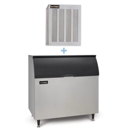 Ice Maker w/ Bin, flake-style, air-cooled, self-contained condenser, approximately 900 lb/408 kg production/24 hours, stainless steel finish, 115v/60/1-ph, 21.0 amps, cULus, NSF, CE; Ice Bin w/ Bin Top: 854 lb storage capacity, 48″W x 31″D x 50″H, top-hinged, slope front door, for top-mounted Ice Maker w/ Bin, polyethylene interior, durable stainless finish exterior, 6″ legs, NSF