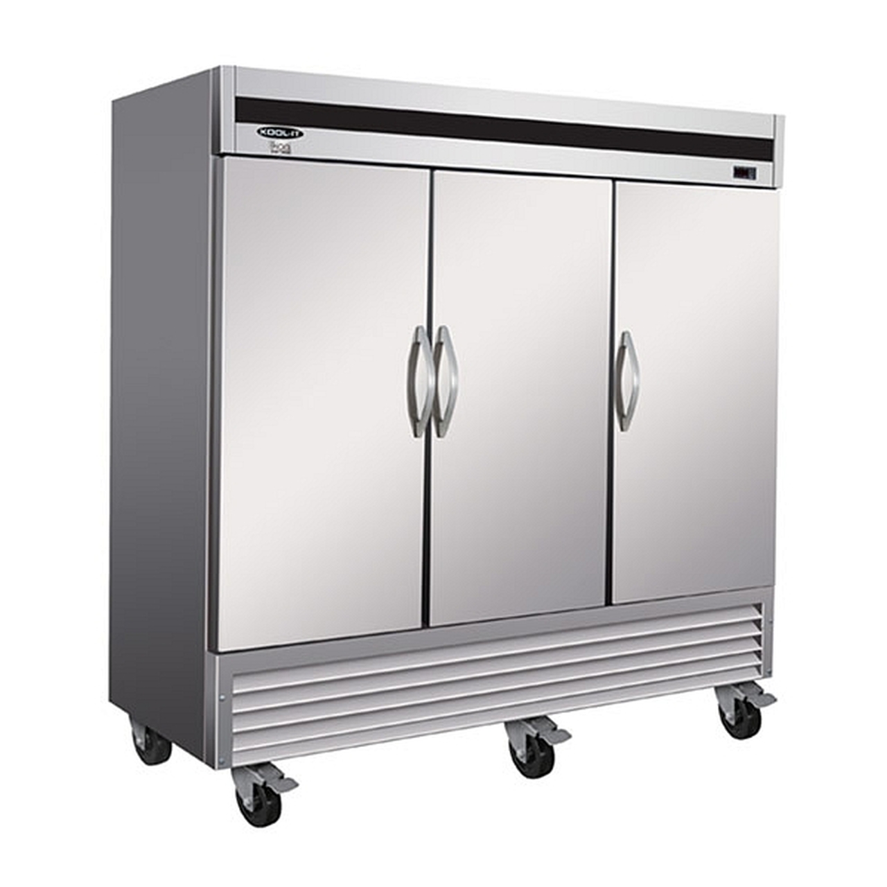The Ikon Series commercial Reach-In Bottom Mounted Freezer by Kool-it features three flexible, heavy-duty epoxy coated wire shelves per door section. IKON Series Refrigerator reach-in three-section 81″W x 32-7/10″D x 82-3/10″H (3) field reversible locking solid stainless steel doors and (9) adjustable shelves accommodate full-size sheet pans, electronic thermostat 33° to 41°F temperature range LED temperature display condensate evaporator stainless steel & aluminum interior stainless steel front & sides swivel casters (2) braked bottom-mounted self-contained refrigeration system 3/4 HP 115v/60/1-ph.