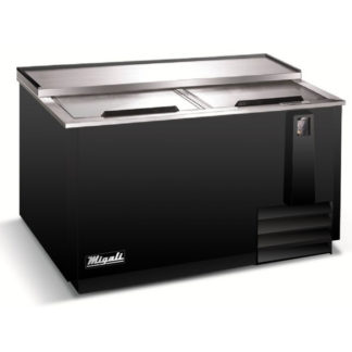 IKON Bottle Cooler, flat top, 18.5 cu. ft. capacity, 64-3/10″W x 27″D x 35″H, deep well, stainless steel top with rear raised glass rails, (2) sliding lids (lockable), electronic thermostat, 33° to 41°F temperature range, digital LED temperature display, (3) bin dividers, bottle opener with cap catcher, stainless steel interior, black exterior, side-mounted self-contained refrigeration, R-600A refrigerant, 1″ wheels, 1/2 hp, 115v/60/1-ph, 3 amps, cord with NEMA 5-15P, cETLus, ETL-Sanitation
