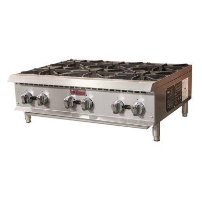 Hotplate, gas, 36.5″ W x 34.1″ D, (6) 25,000 BTU octagonal cast iron burners, cast iron grate, standing pilot light per burner, manual controls, serviceable from front, stainless steel cabinet, adjustable stainless steel legs, 150,000 BTU total, CSA-Sanitation, CSA Flame, CSA Star