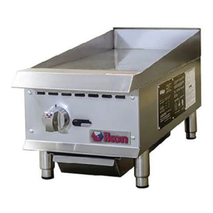 The IKON IMG-12 commercial griddle is constructed of resilient stainless steel. Its wall sides are insulated and its front edge doesn’t conduct heat, so it doesn’t burn the operator if they accidentally touch it. Back and side splash guards are welded to the sides of the griddle plate for security and to ensure oil doesn’t splash over the sides, streamlining grease removal. Users can scrape leftover cooking particles into the 4-inch-wide grease trough and into the removable 31/4-inch grease drawer.