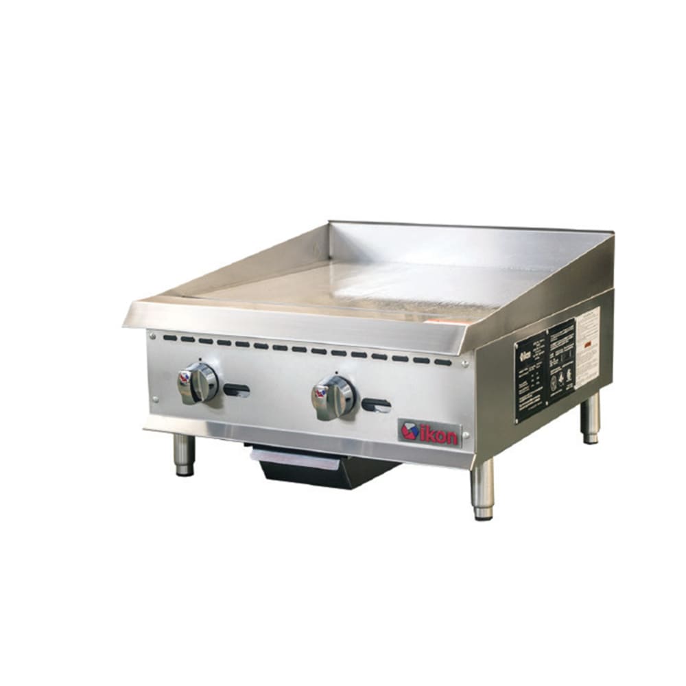 The Ikon Manual Control Griddles are available in 12″, 24”, 36”, 48” & 60” widths, the continous 30,000 BTU output per burner provides even heat to the 3/4” thick polished steel griddle plate