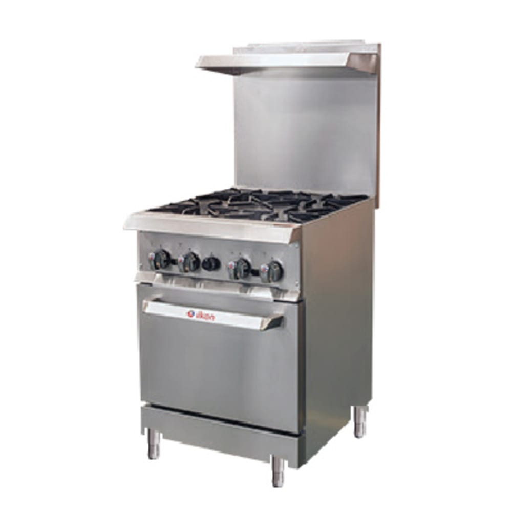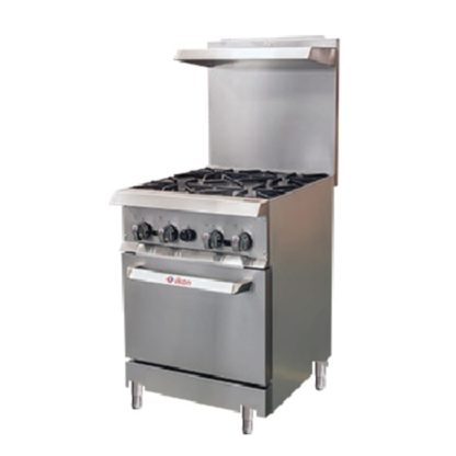 IKON Range, gas, 23.9″ W x 31.4″ D, (4) 30,000 BTU burners, (1) static oven, 3-position oven rack, (2) oven racks, full pull-out crumb tray, manual controls, riser with removable shelf, 12″ cast iron grates, porcelain coated oven interior door, sides & hearth, stainless steel front, back riser & lift off shelf, 1″ adjustable legs, CSA-Sanitation, CSA Flame, CSA Star