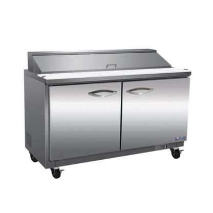 IKON ISP48 Sandwich / Salad Prep Unit, two-section,12 cu. ft. capacity, 48-1/5″ W x 29-9/10″ D x 43-1/5″ H, stainless steel top with opening for (12) 1/6 pans (included), (2) solid hinged doors, (2) adjustable shelves, removable cutting board, electronic thermostat, 33° – 41°F temperature range, LED temperature display, automatic defrost, interior: 304 stainless steel floor, aluminum back wall, ABS sidewalls & door backs, stainless steel exterior, swivel casters (2) braked, rear-mounted self-contained refrigeration system.