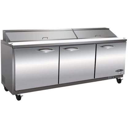 Prepare your sandwiches or salads on IKON ISP72M Megatop Sandwich Prep Table. This is a sturdy, sleek refrigerated unit that will keep your goods at safe serving temperature and increase your efficiency. Plus, it’s “mega top” will allow you to hold more ingredients, which can make your food preparation much quicker. The table also features an electronic thermostat with LED temperature display and 2.5″ casters. It has three-section, 71-7/10″W x 34-1/2″D x 43-1/5″H, stainless steel top with opening for (27) 1/6 pans (included), (3) solid hinged doors, (3) adjustable shelves, removable cutting board, electronic thermostat, 33° – 41°F temperature range, LED temperature display, automatic defrost, ABS interior with aluminum floor, stainless steel front & sides, swivel casters (2) braked, rear-mounted self-contained refrigeration system.