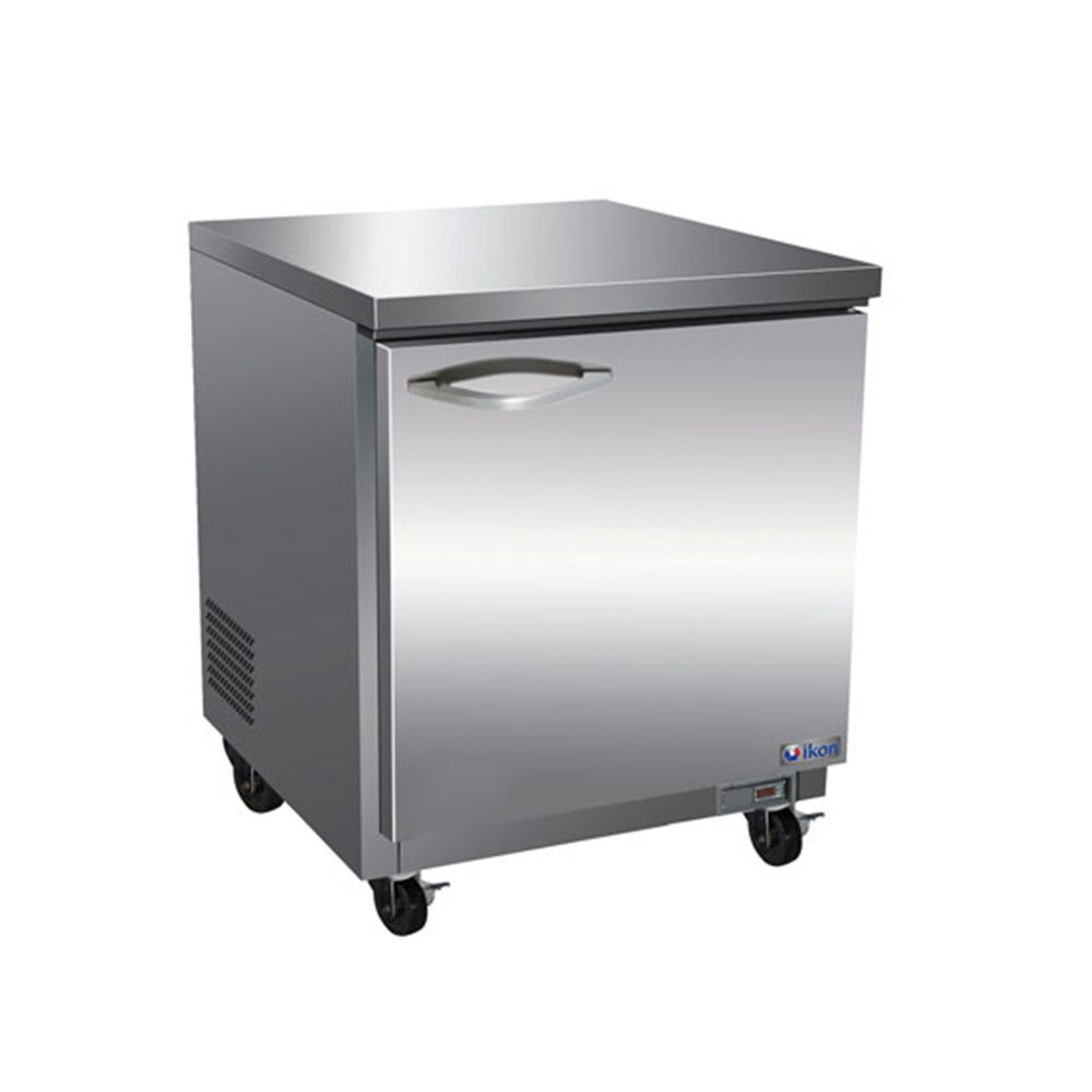 The IUC28R is a three-section unit that measures up to 71” inches, made of stainless steel, and has a temperature range of 33° to -40°F. IKON Series Undercounter Refrigerator, one-section, 27-4/5″ W x 29-9/10″ D x 35-1/2″ H, stainless steel top, (1) solid hinged door, (1) epoxy coated wire shelf, electronic thermostat, 33° to -40°F temperature range, LED temperature display, automatic defrost, ABS interior with aluminum floor, stainless steel front & sides, swivel casters (2) braked, rear-mounted self-contained refrigeration system, 1/2 HP, 115v/60/1-ph, 7.0 amps.