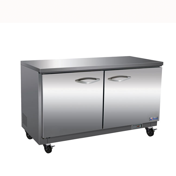 The IUC61F is a two-section unit that measures up to 61” inches, made of stainless steel, has a temperature range of 0° to -10°F. IKON Undercounter Freezer, two-section,15.5 cu. ft. capacity, 61-1/5″W x 29-9/10″D x 35-1/2″H, stainless steel top, (2) solid hinged anti-frost doors, (2) epoxy coated wire shelves. This freezer comes with electronic thermostat, 0° to -10°F temperature range, digital LED temperature display, automatic defrost, interior: 304 stainless steel floor, aluminum back wall, ABS side walls & door backs, stainless steel front & sides, 2-1/2″ swivel casters (2) braked, rear-mounted self-contained refrigeration system, R290 refrigerant, 1/2 HP, 115v/60/1-ph, 5.0 amps, NEMA 5-15P, cETLus, ETL-Sanitation.