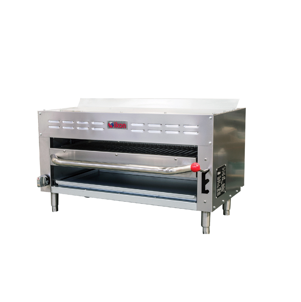 IKON Salamander Broiler, gas, 36″ W x 24.7″ D (91.4cm x 62.7cm), (1) 35,000 BTU infra-red burner, 3-level broiling positions, manual controls, standing pilot, full width broiler pan, 3-position spring balanced rack with ball grip handle, ready mount over any Ikon 36 or 60 inch range, stainless steel front & sides, stainless steel non-skid legs, natural gas/liquid propane conversion kit, 35,000 BTU total