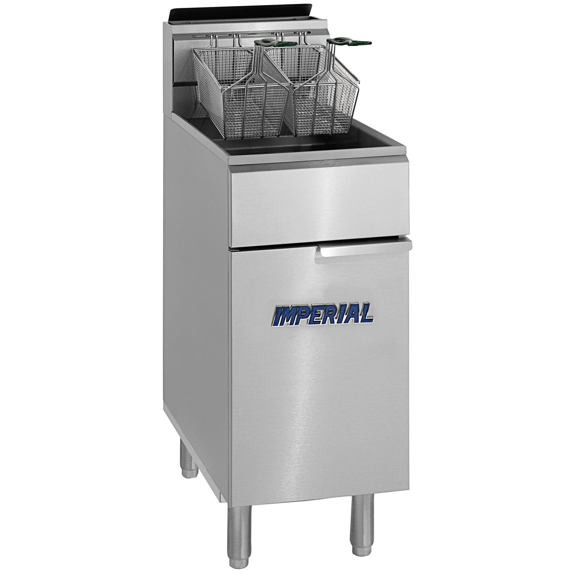 The recessed bottom in this Imperial IFS-40 gas fryer is slanted, directing oil into the 11⁄4-inch drain to simplify cleaning. Nickel-plated fryer baskets are included with the unit, and their coated handles prevent heat transfer and minimize injury. The fryer oil temperature is adjustable from 200 to 400 degrees Fahrenheit, and this level can be set on the millivolt controller.