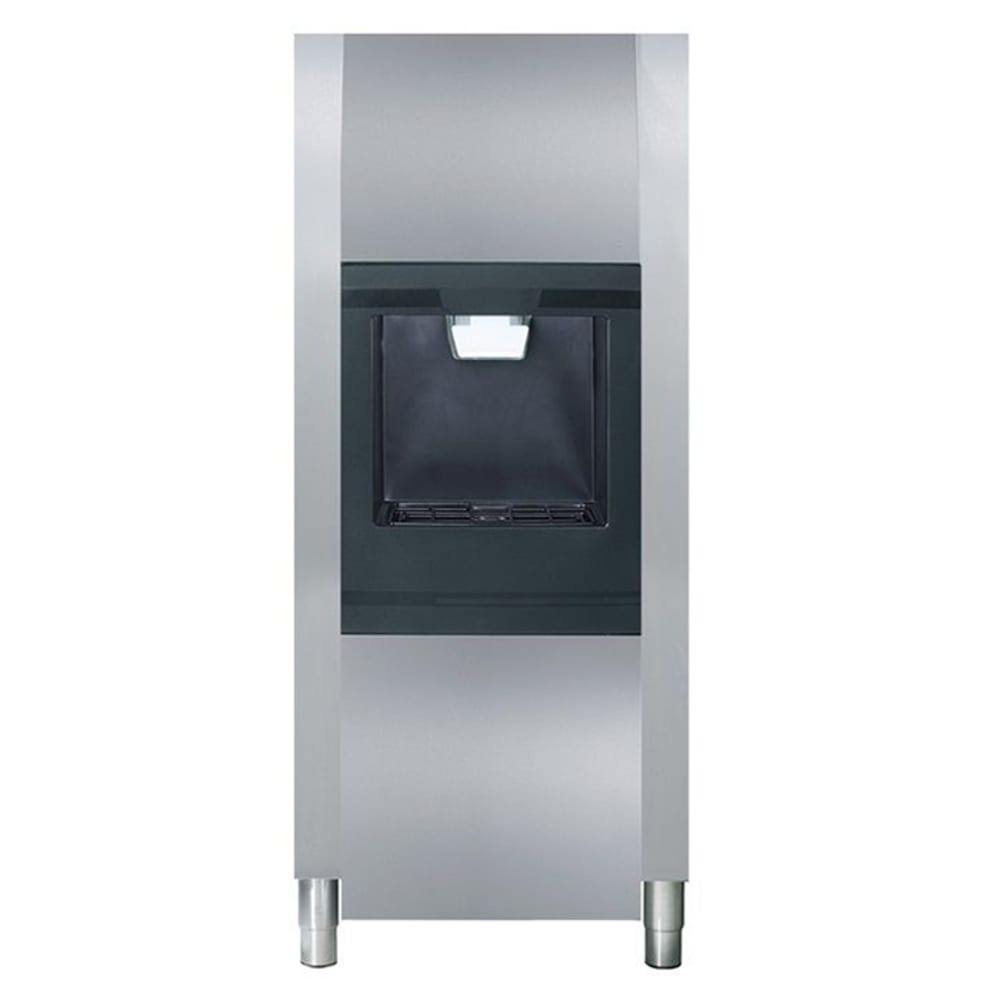 Hotel Style Ice Dispenser of 22 inches, (half or full ice cube), 22″W x 32-7/8″D x 54″H, 128 lbs. storage capacity, 0.24 lbs./ second dispensing speed, 304 stainless steel construction, 6″ adjustable legs, cETLus, NSF