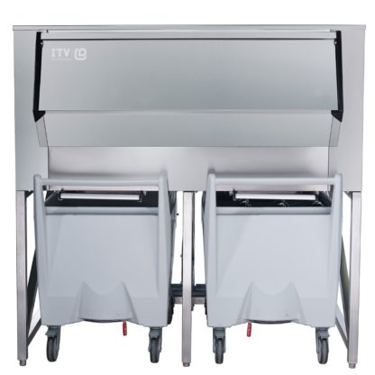 Ice Storage Bin with Carts, 60″ W, 911 lbs. AHRI Certified storage capacity, seamless one-piece vat with rounded corners, 304 stainless steel body with galvanized back & bottom, includes ice paddle, (2) polyethylene carts with braking, drainage system & cover