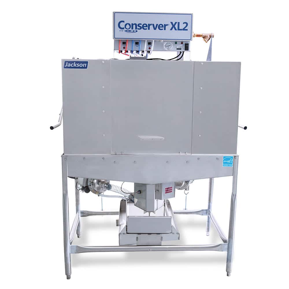 Conserver Dishwasher, door type, double rack, 50-1/2″W x 25″D x 68-1/2″H, low temperature chemical sanitizing, straight-thru operation, approximately (74) racks/hour, (3) built-in dispenser pumps, built-in scrap accumulator, removable screen, drain pump, auto-start, stainless steel construction, 3″ adjustable stainless steel bullet feet, 1 HP wash pump, cETLus, NSF, ENERGY STAR, 115v/60/1ph
