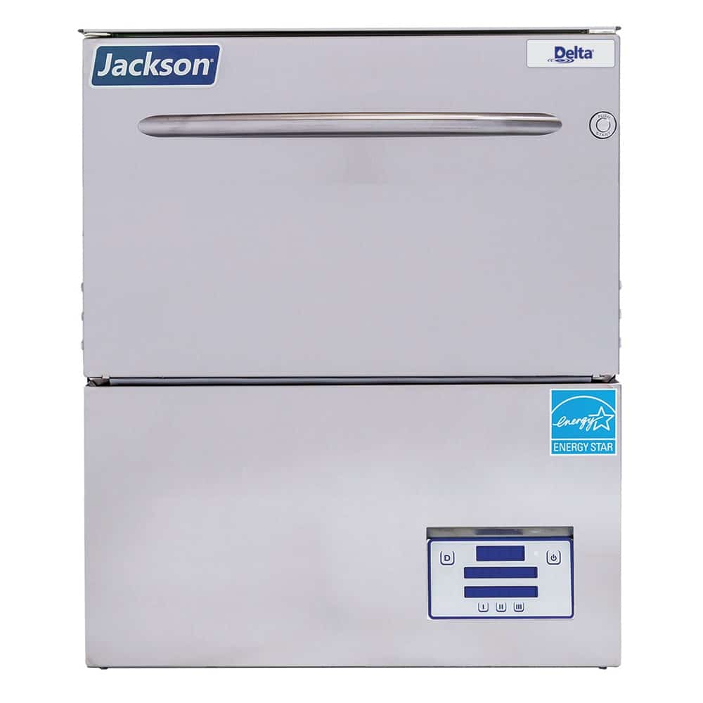 Delta Dish/Glasswasher, door type, 24-1/4″W x 26-7/8″D x 28″H, high temperature sanitizing, built-in booster with Sani-Sure final rise system, steam elimination & energy recovery system, approximately (20) racks or (720) glasses/hour, built-in dispensing pumps & priming switches, delime cycle, digital LED control panel, universal timer, auto-fill, push-button start, pressure regulator, automatic pumped drain, includes (1) peg rack & (1) combination rack, stainless steel construction, cETLus, ETL-Sanitation, ENERGY STAR
