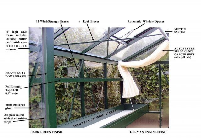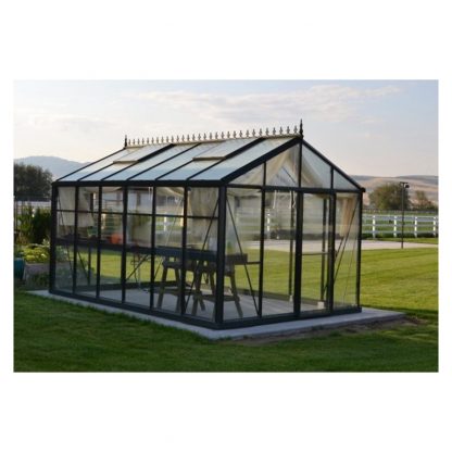 The Royal Victorian VI 34 Greenhouse provides the optimum environment for gardening year-round while adding a stately presence to any backyard setting. The dark green aluminum framework, which is large in scale, thick gauge, and strong, the tempered glass panels with heavy-duty rubber seals, and full 6 ft. 7 in. wall height combine to create a comfortable interior work space and a full view of your surroundings. Whether you are over-wintering special or valuable plants from the cold, starting seedlings or creating a tropical jungle, you can enjoy years of maintenance free use with this fully loaded kit. Our automatic roof openers, built-in misting system and interior shade netting provide a healthy growing environment during spring and summer.