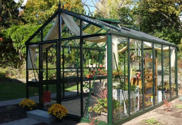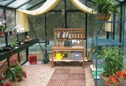 Consider tinting the glass on your greenhouse. Many customers in hot climates enjoy the benefits of cooler greenhouse temperatures. Tinted windows gives a unique look to your greenhouse. Window tinting can be done locally. The Royal Victorian VI 34 Greenhouse’s framework base can be anchored to bare level ground, a wood platform, or a concrete slab.