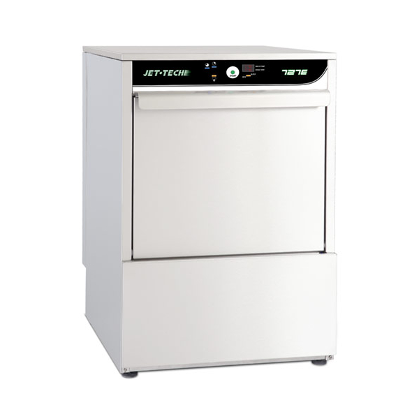 The 727-E is an ENERGY STAR certified high-temperature undercounter dishwasher from Jet Tech with a built-in booster that will clean up to 30 racks per hour. The body, external housing, wash tank, and all chassis components on this high-temperature undercounter dishwasher are brushed stainless steel.
