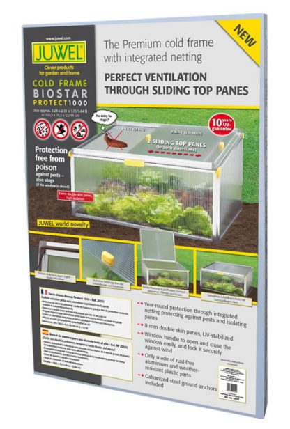 Thicker materials, strong construction, and easy-to-use: The Juwel Biostar 1000 Premium Cold Frame is perfect for year-round growing in any small garden or backyard application. Sliding top panes offer excellent ventilation while netting keeps harmful destructive pests.