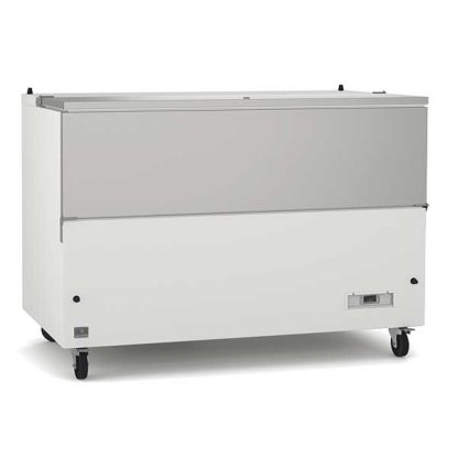 School milk cooler with exterior back panel in white-painted steel, bottom panel in galvanized steel, exterior side panels in white-painted steel and top in 430 stainless steel; interior back and side panels in 430 stainless steel, interior bottom in 304 stainless steel. Interior drain and electronic temperature control. Heavy duty locking casters, removable door gasket, lid and key to protect the unit.