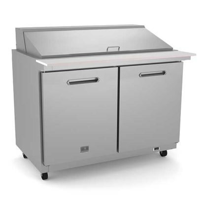 Full-depth cutting board of 48x9x0,5 in. Control panel, Vinyl-Coated Steel adjustable shelves, removable door gaskets and self-closing doors with 90-degree stay-open feature. Temperature range: +33/+41°F.