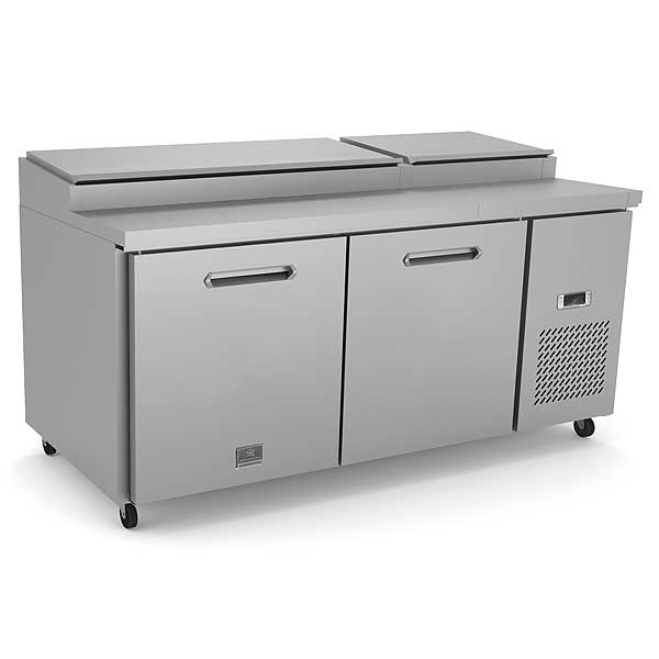 2-door pizza refrigerated preparation table. Exterior back panel in aluminium, exterior bottom panel in galvanized steel, exterior side and top panel in 430 stainless steel; interior back, side panels and bottom panel in 304 stainless steel, worktop in 430 stainless steel.