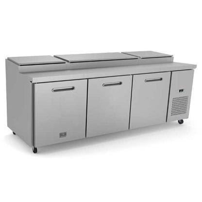 3-door pizza refrigerated preparation table. Exterior back panel in aluminium, exterior bottom panel in galvanized steel, exterior side and top panel in 430 stainless steel; interior back, side panels and bottom panel in 304 stainless steel, worktop in 430 stainless steel.